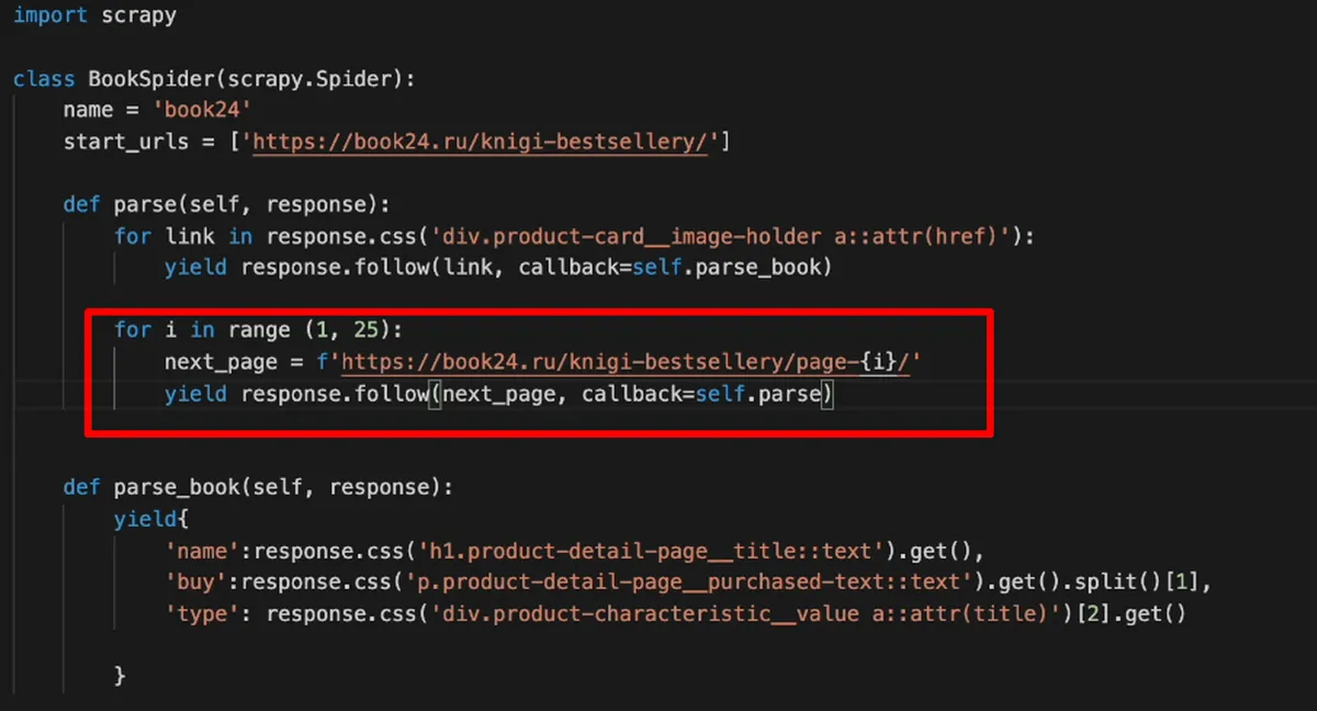 Нам осталось сделать добавить переход по страницам. Так как переходить на новую страницу нужно, когда собрана вся информация на первой странице, код с переходом добавим внизу метода parse. Переходить мы будем с помощью уже известного слова yield и команды response.follow. Только на этот раз переходить будем не по ссылке внутрь книги, а по сслыке на новую страницу.