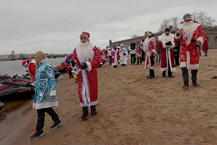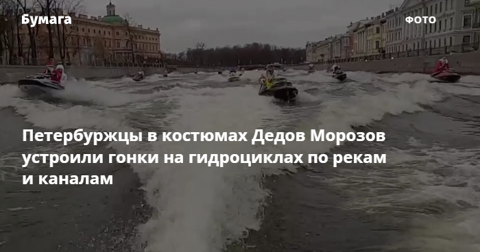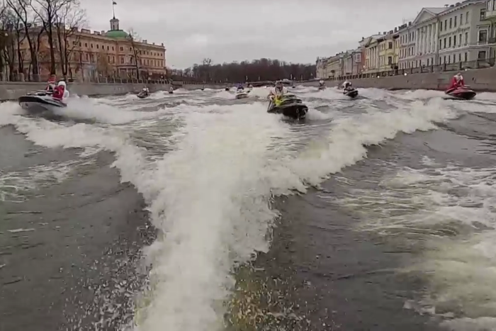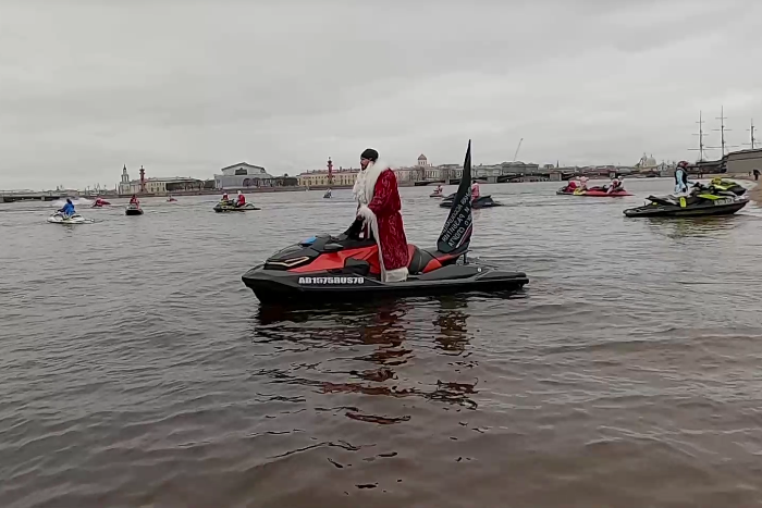 В Петербурге 13 ноября прошла акция «Деды Морозы на воде» — петербуржцы в костюмах прокатились на гидроциклах. Очевидцы поделились снимками в соцсетях, трансляцию вел телеканал «Санкт-Петербург».