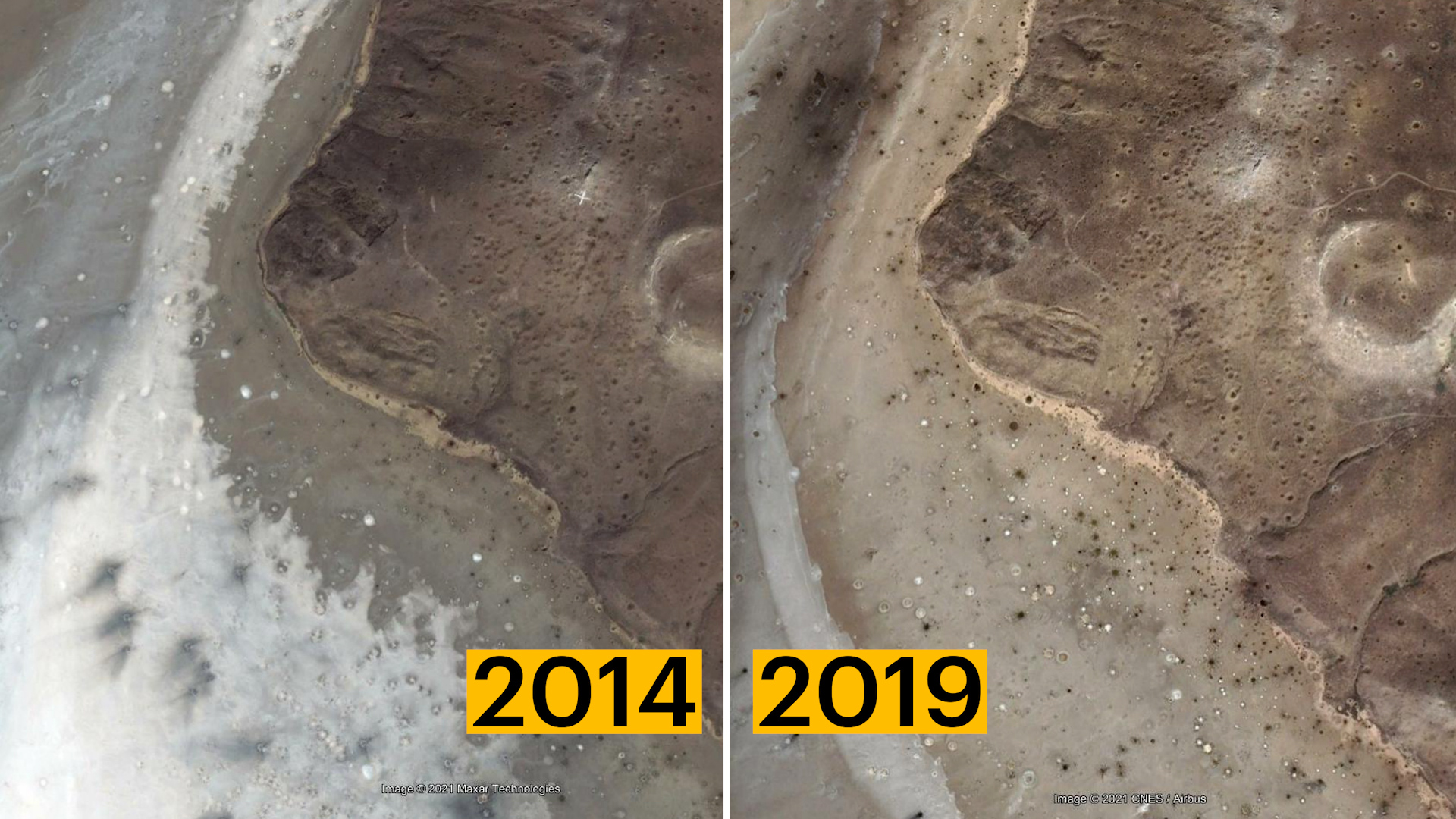 Мы проверили слова Алексея Василюка с помощью Google Earth Pro. Сравнили территорию над озером Узунларское, где расположен полигон для бомбометания на Опуке, на карте в 2014 и 2019 годах. Сейчас эти земли в воронках и кратерах больше похожи на поверхность Луны.