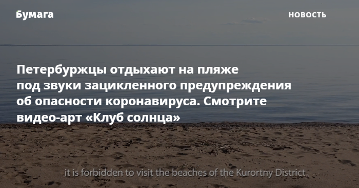 «Клуб солнца» — это снятое на петербургском пляже видео, на котором звучит автоматическое предупреждение об опасности распространения коронавируса и запрете посещения пляжей Курортного района (запрет вводили весной 2020 года). При этом люди продолжают заниматься обычным делами: загорают, жарят шашлыки, гуляют и устраивают пикники.