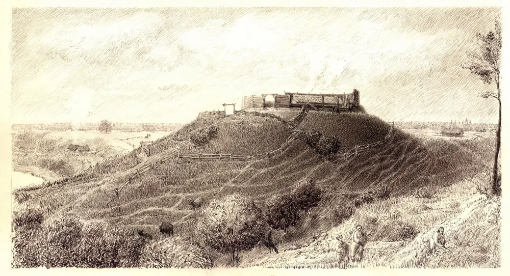 В Москворечье в I тысячелетии до н. э. (т. е. в эпоху античности) существовала своя особая москворецкая культура, которая называется дьяковской. Вот реконструкция дьяковского городища, ее сделал Николай Александрович Кренке с художником Леонидом Ланцманом (рис. 3). Конечно, мы не знаем, как местные жители себя называли. Но мы знаем, как они называли реку, на которой мы живем, — Москва. Это, видимо, их название, еще с тех времен до нас дошедшее.