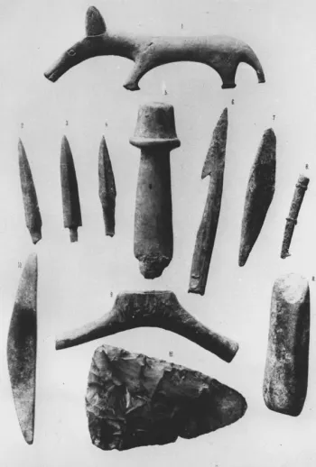 — Да. На слайде (рис. 4) находки. Они были обнаружены в XIX веке на Дьяковом городище. Это культура железного века. Эти вещи ничем не отличаются от аналогичных большинства культур железного века. Но я бы хотел выделить два очень важных фактора. Дьяково городище существовало около тысячи лет. На этом месте тысячу лет жили одни и те же по укладу люди. Это было то же хозяйство, та же точка. Если бы это было на Ближнем Востоке, то за тысячелетие здесь выросла бы гора, телль, потому что там архитектура сырцовая, а глина создает огромную толщину слоев и, соответственно, высоту памятника.