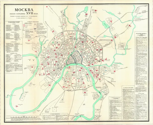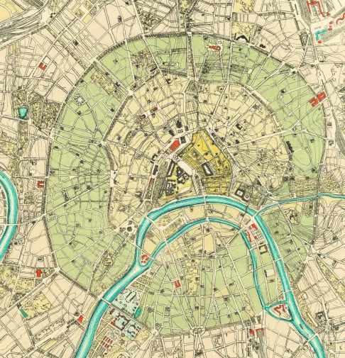 Сама история Москвы в какой-то степени — очень московский сюжет. Возьмем план Москвы XVII века (рис. 1). Казалось бы, город сегодня совершенно другой. Ничего похожего на это, кроме Кремля с его башнями и соборами и рек, перед нами нет. Но вот следующий слайд (рис. 2) Мы увидим те же самые очертания. Это так называемый «Золотой город», проект Москвы 1920-х годов. У него абсолютно те же самые обводы, те же самые линии, по которым мы ходим. Это ранний советский план будущей Москвы. Она не совсем такая получилась. Но важно, что в сознании планировщика абсолютно всё это оставалось.