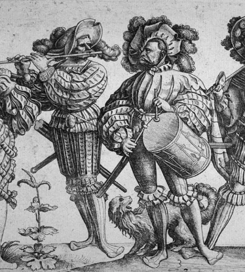 — Немецких. Два музицирующих ландскнехта. На обоих изображениях поперечная флейта и барабан. У них даже оружие и элементы одежды похожи. И всё это с разрезами, с фестонами — это неоспоримо свидетельствует, что прототип западноевропейский. Исполнение местное. И притягательна эта западная культура и почти неузнаваема в нашей переработке. Таких элементов будет найдено очень много.