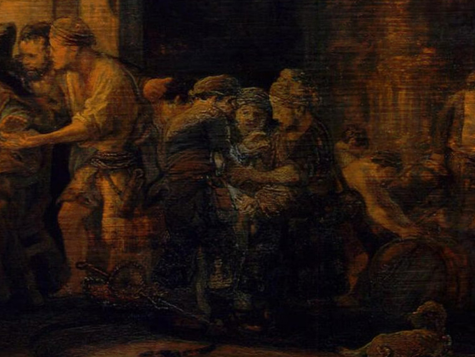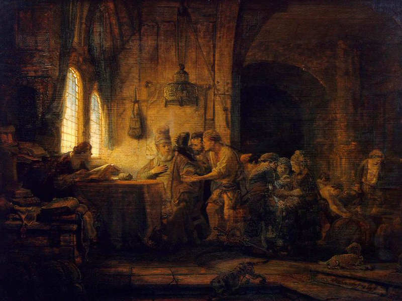 На этой картине, иллюстрирующей евангельскую притчу, изображена освещенная солнцем горница, полная людей. Если присмотреться, можно заметить, что головные уборы работников на заднем плане изменили цвет: их когда-то синие тюрбаны стали серыми.