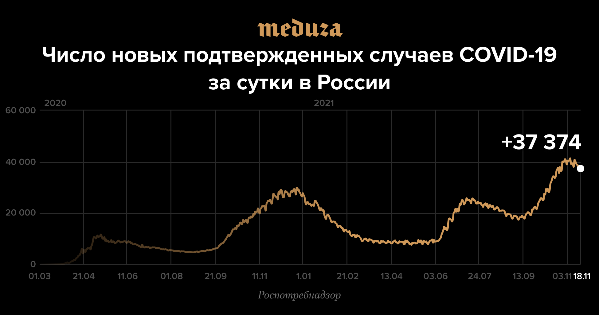 На утро 18 ноября выявлены 37 374 новых случая заболеваемости ковидом. Общее число заболевших достигло 9 219 912 человек.