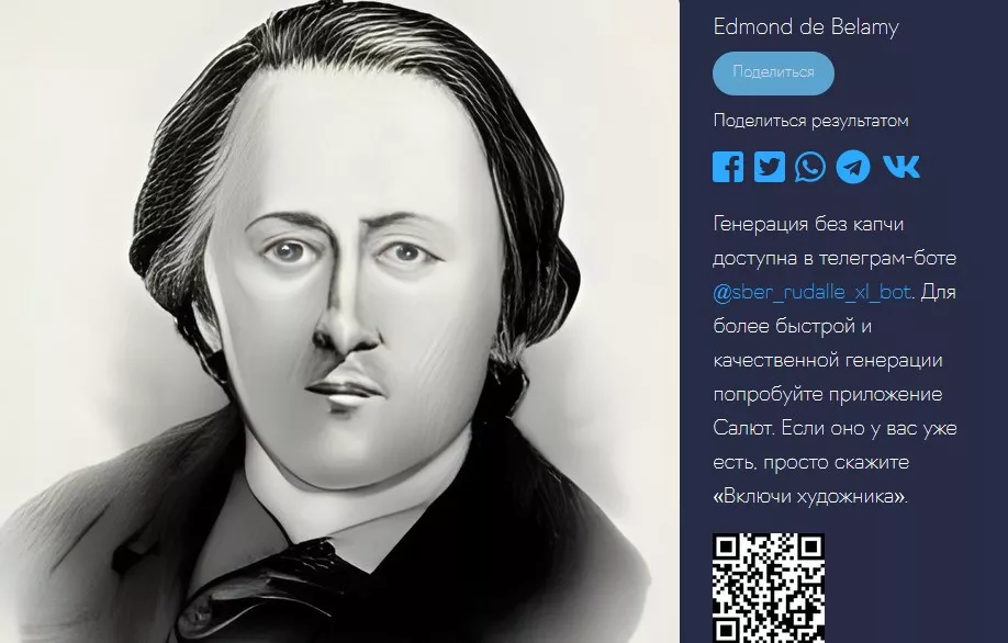 Кстати, есть озадачить популярную отечественную нейросеть, введя название этой работы — Edmond de Belamy, — получится вот что.