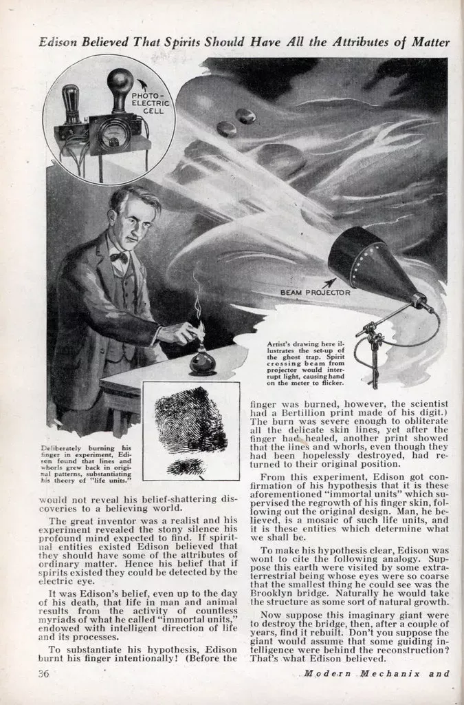 Казавшаяся ранее невообразимой возможность передавать голос на дальние расстояния вдохновила пытливые умы на более радикальные эксперименты. Месмеристы использовали «животный магнетизм» в медицинских целях, а Томас Эдисон, по чьему распоряжению к тому времени уже убили сорок четыре собаки, шесть телят, двух лошадей и одного слона в Войне токов (в которой Эдисон все-таки проиграл), придумал два моднейших гаджета для общения с мертвыми — некрограф (1895) и некрофон (1920). По задумке автора, даже получившего патент на свои изобретения, сверхчувствительные приборы должны ловить тонкие сигналы — энергетические колебания, источником которых становятся умершие. Рассказывают, что Эдисон договорился со своим коллегой Уильямом Динвидди: кто умрет первым, тот пусть выйдет на связь. Первым умер Динвидди. В интервью журналу Scientific American Эдисон рассказывал, что имел с ним общение посредством своего ноу-хау. А в 1933-м журналисты из независимого СМИ Modern Mechanix Magazine присутствовали на сеансе с использованием некрофона.
