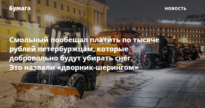 Как говорится на сайте Смольного, во время «залповых снегопадов» жителей будут приглашать убирать улицы и внутриквартальные территории. За это будут платить около 1 тысяч рублей в день вечером того же дня. Отвечать за это будут районные жилищные агентства и городские ЖКС: помощники коммунальщиков смогут направить документы на заключение договора подряда в кадровые службы, в том числе дистанционно. В Калининском районе уже есть 100 добровольцев, сказали чиновники.