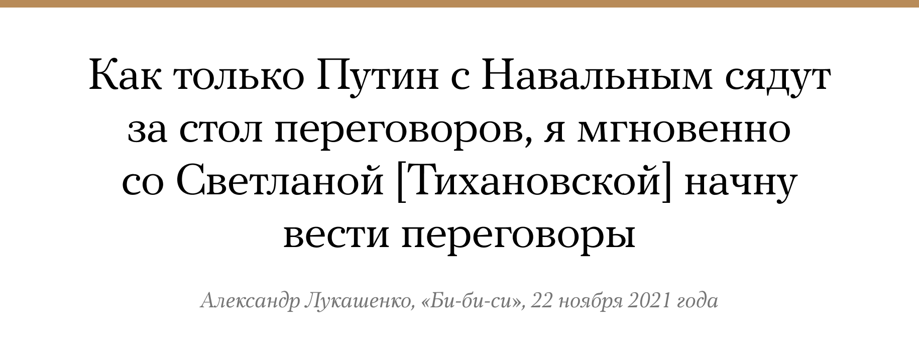 Александр Лукашенко в интервью «Би-би-си» заявил, что готов сесть за стол переговоров со Светланой Тихановской только после того, как Владимир Путин начнет переговоры с Алексеем Навальным. При этом Лукашенко выразил мнение, что Путин никогда такого не сделает, так как для него Навальный — не оппозиционер, а «предатель интересов России». Такое заявление Лукашенко сделал после того, как Путин призвал власти Белоруссии к диалогу с оппозицией.