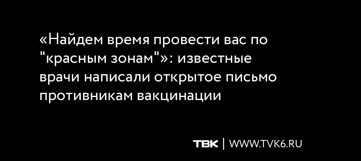 «Нам известна ваша позиция по поводу вакцинации граждан России от COVID-19. Мы все сейчас немного заняты, и вы, наверное, догадываетесь чем. Однако, учитывая то, сколько людей вас читают, слушают и прислушиваются, мы найдем время для того, чтобы провести вас по красным зонам, реанимациям и патологоанатомическим отделениям наших больниц. Может, после этого вы измените свою позицию, и меньше людей будет умирать», – приводят отрывок из письма РИА Новости.