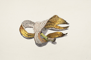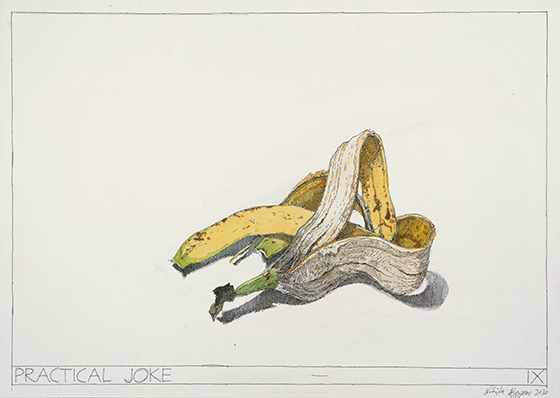 Некоторых зрителей, очевидно, смущает однородность представленных серий. За редким исключением — графические натюрморты, которых действительно много. Принцип каждой отдельной серии — включать в себя разные, но похожие работы — как, например, серия вариаций компоновки скорлупок мидий с палочками, яблоками и камушками, представленная тремя десятками листов с посвящением Марселю Бротарсу («Ловкачка-мидия прелестна»). Эта формула переносится на всю выставку, где графика в рамах кажется нескончаемым потоком сознания. На одной стене собраны идентичные заснеженные деревья, сопровождаемые мыслями художника, на другой — идентичные по технике зарисовки карандашом, дополняемые названиями на английском, вымышленные «замечательные люди», якобы встреченные на пляже, много-много акварельных банановых шкурок разной конфигурации, одинаково очаровательных в своих барочных изгибах.