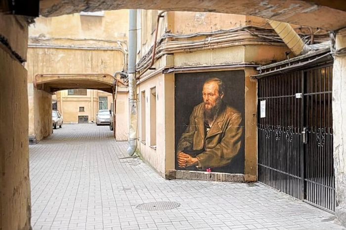 Портрет Достоевского появился во дворе дома в Кузнечном переулке, 8 еще в 2019 году. Его закрасили, но в 2020-м художники его восстановили. Потом портрет снова закрасили — художники опять восстановили фреску и увеличили ее в размерах.