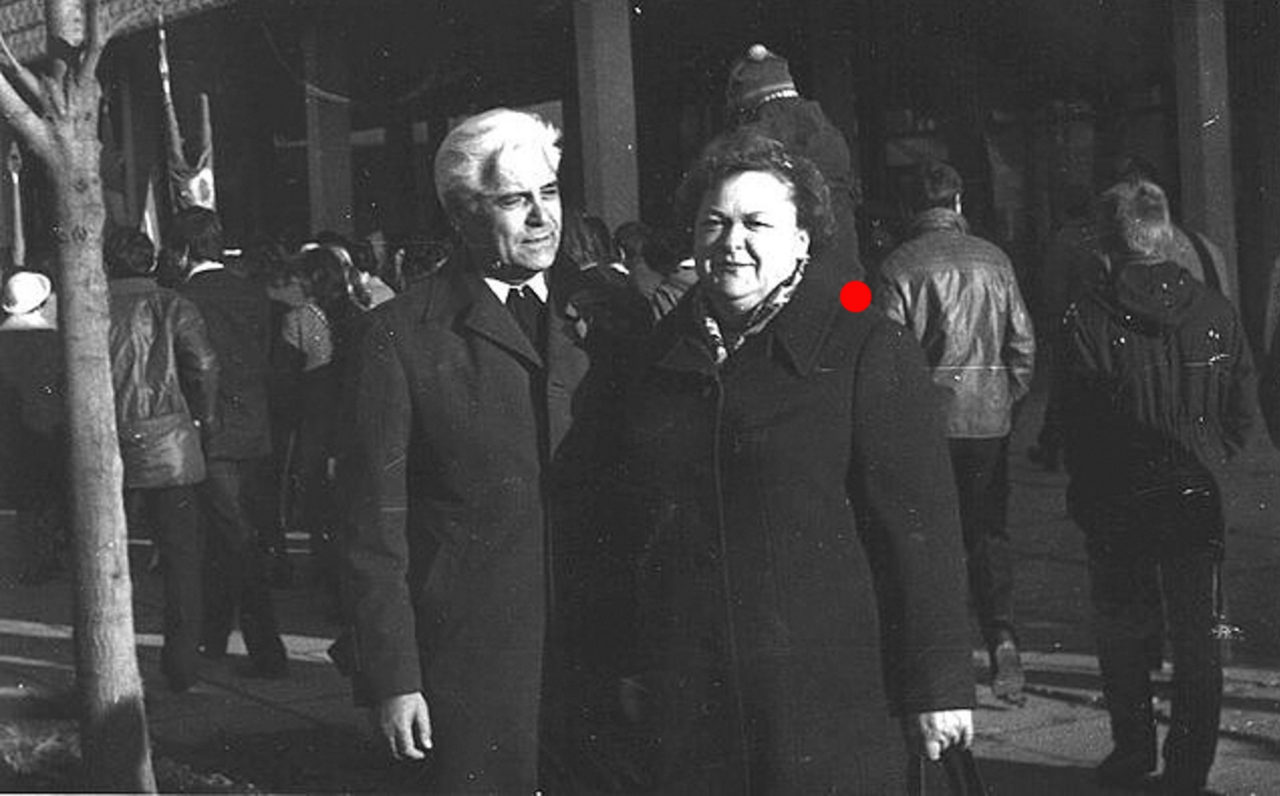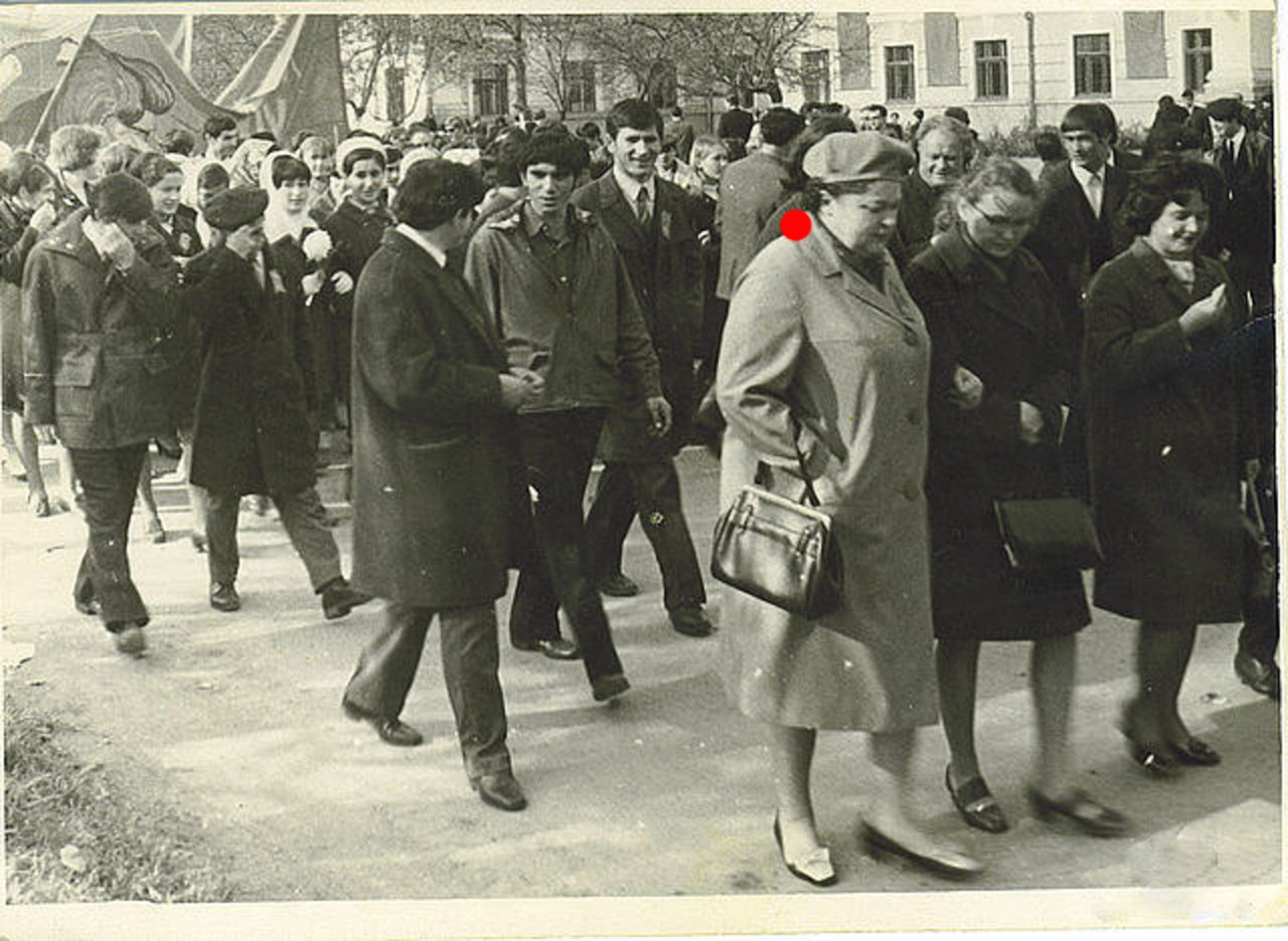 Архивное фото с демонстрации, возможно, на Первое мая или Седьмое ноября. Преподаватели Чечено-Ингушского государственного университета, среди них — моя бабушка (отмечена красной точкой). Фото предоставили бабушкины коллеги и ученикиФото: Ника Оксенчук