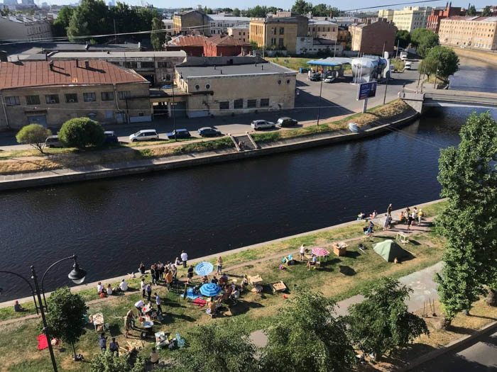 Пряжка — место исключительно местных. Людям со стороны может показаться, что тут нечего делать. А местные выгуливают собак, загорают, занимаются йогой и бегом. Этим летом мы с соседями устраивали тут субботники, пикники, праздники и просто собирались, когда нужно было что-то обсудить. Так что, если хотите познакомиться с местными, идите гулять на Пряжку.