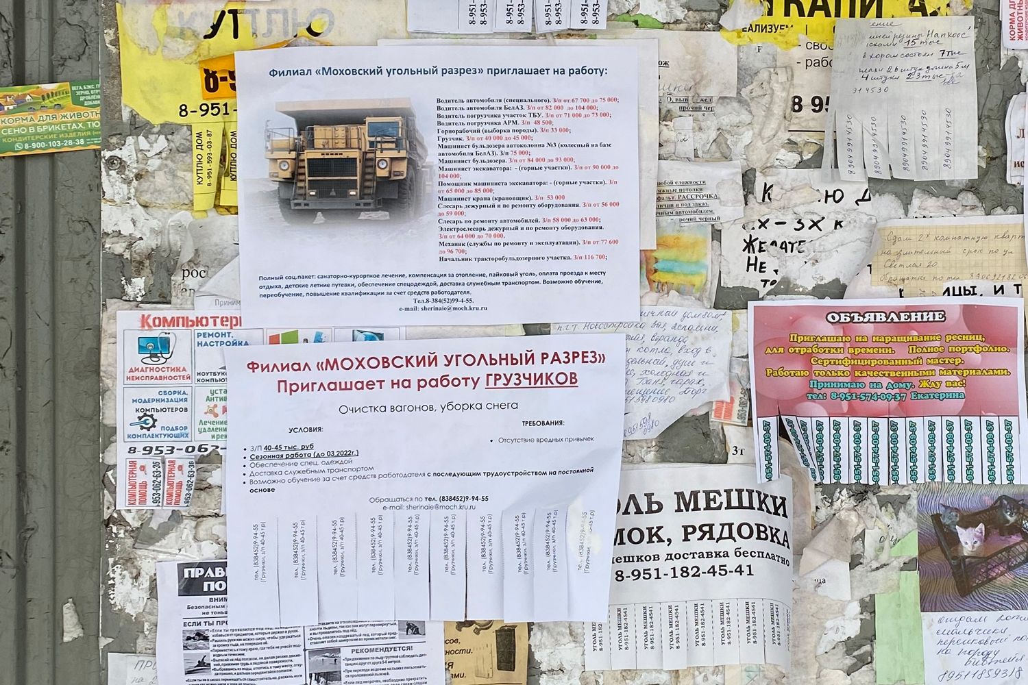 От Грамотеино до Белово на рейсовом автобусе 30 минут. На остановке висят объявления: филиал «Моховский угольный разрез» приглашает на работу грузчиков, крановщиков, машинистов, горнорабочих. Зарплату обещают от 30-40 тысяч рублей, до 100 тысяч самым квалифицированным.