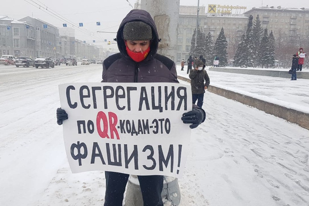 В Новосибирске прошла серия пикетов против политических репрессий. Часть плакатов касалась введения QR-кодов.