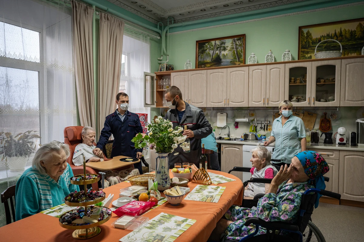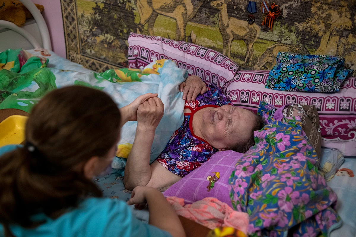 Сейчас в Доме милосердия в Поречье работает сорок четыре человека, это больше, чем в местной школе. Градообразующее предприятие. Дом милосердия стал центром притяжения не только в селе, но и собрал под своей крышей удивительные истории. Помощница по уходу Аня — выпускница школы-интерната в Нижегородской области. Ее нашла Нюта Федермессер во время одной из командировок с проектом «Регион заботы». Теперь у Ани есть не только новый дом в Поречье, но и призвание. Она знакомит нас с подопечными из палаты на первом этаже.
