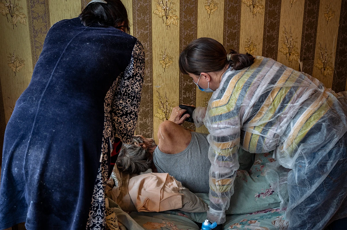 Наша следующая остановка — дом в селе Петровское, здесь нужна помощь в помывке пациента с ампутированной ногой. О своем приезде в эту семью бригада всегда предупреждает заранее, чтобы жена могла с утра растопить печь и нагреть воду. Пока Наталья и Елена делают все регулярные проверки — давление, дыхание, сатурация, Костя с женой пациента готовят все в ванной. Манипуляции максимально бережные. Когда помощь больше не требуется, пациента с женой оставляют наедине, чтобы потом помочь пересадить в кресло. Даже разговоры становятся медленнее и спокойнее, пока бригада за работой.