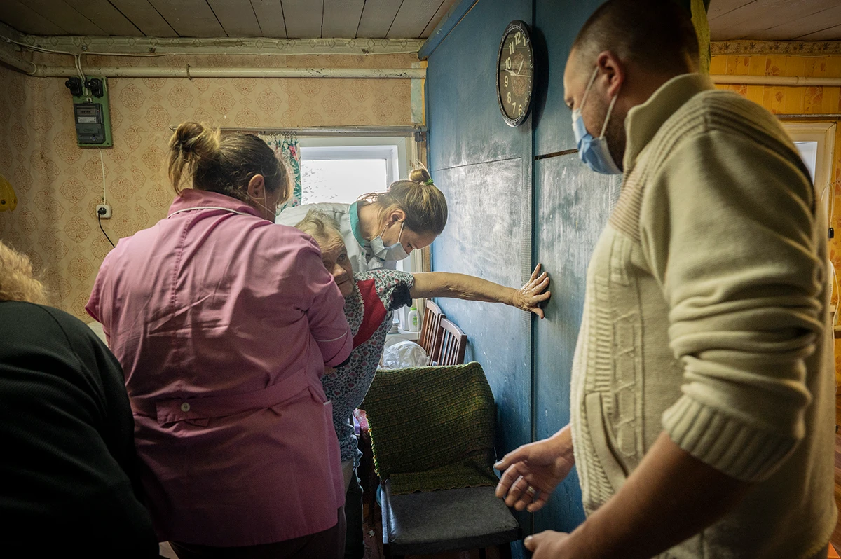У деревенского дома бегают куры, на печке пугливая кошка шпротного окраса. Мы застаем дома девушку, приехавшую помогать своему деду в уходе за лежачей бабушкой. Она старается приезжать раз в неделю. Выездная служба тоже навещает их регулярно. У дедушки онкология, а бабушка слегла неожиданно — еще недавно была ходячая, помогала мужу. Теперь он заботится о ней. А сотрудники выездной службы приезжают помочь с медицинскими процедурами, мытьем, помогают пересадить бабушку в кресло, чтобы поменять постельное белье, проверить работу противопролежневого матраса. Внучка просит у Кости плакаты Дома милосердия, чтобы повесить в окрестных селах. Ее муж работает в полиции, рассказывает, что в этом районе еще очень мало знают, что есть куда обратиться. А одиноких стариков — много.
