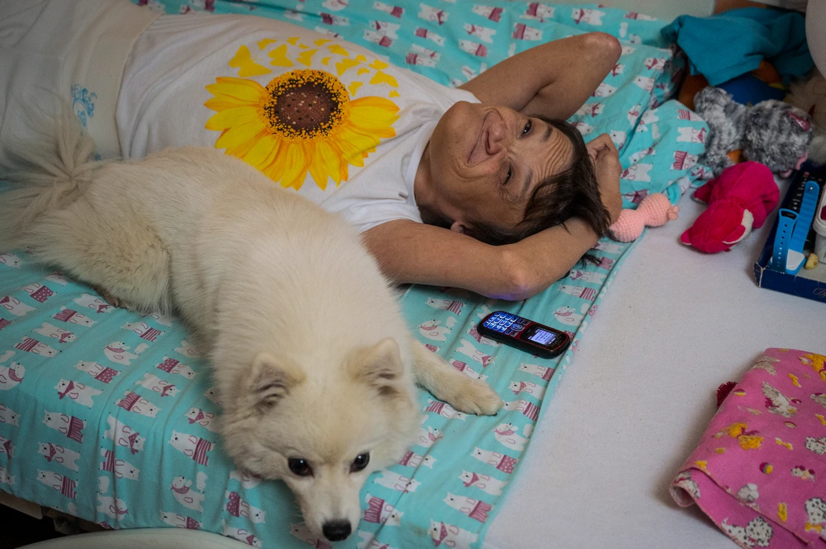 Ольга и Света очень любят животных, мы проводим целый вечер в их палате вместе с моей собакой-терапевтом Молли. Оля вспоминает свою деревенскую собаку и катает Молли на электрическом кресле. А Света, к которой Молли чувствует огромную симпатию, кормит ее печеньем и обещает написать про нее стихотворение. Молли запрыгнула на ее кровать, только войдя в палату, сразу начала облизывать руки и лицо, они пахнут кремом после вечерних процедур. Она редко так быстро проявляет доверие и бурную радость к незнакомым людям. Света рада ей не меньше. На звук ее смеха приходит охранник Валерий, заглядывает в палату и с улыбкой замирает в дверях.
