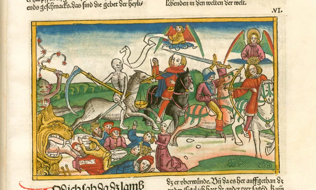 Четыре всадника Апокалипсиса. Иллюстрации Апокалипсиса из Библии Квентилла-Кобергера, 1483