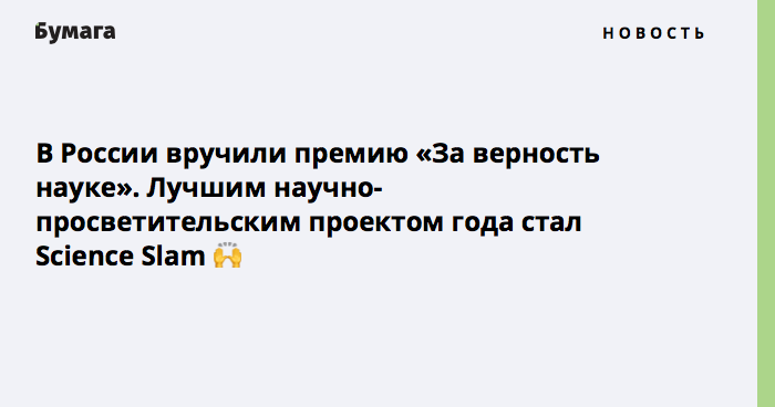 В России объявили победителей VII Всероссийской премии «За верность науке». Лучшим научно-просветительским проектом года стал Science Slam.