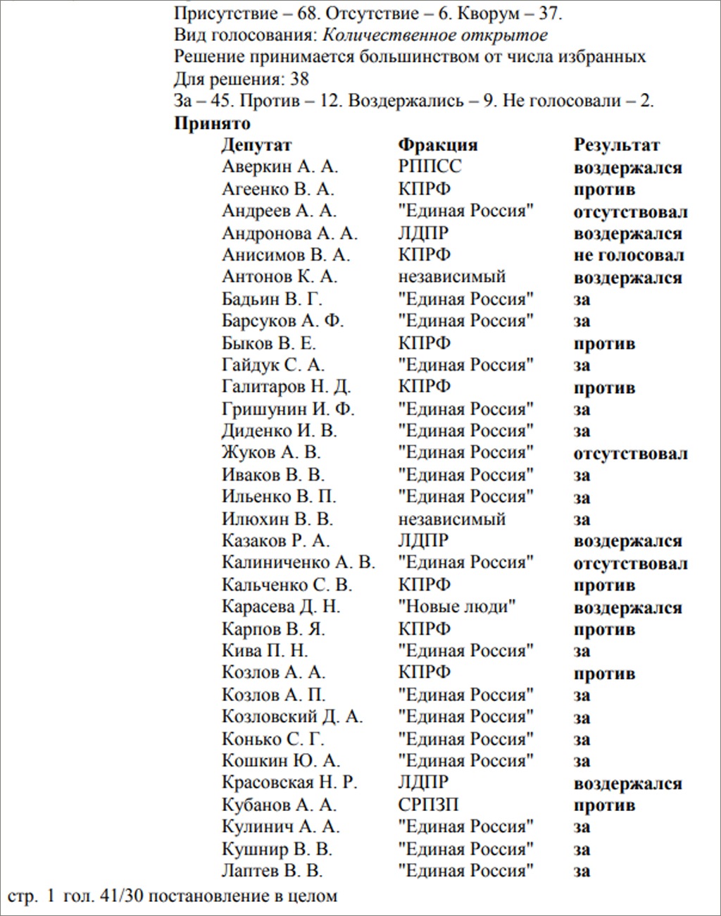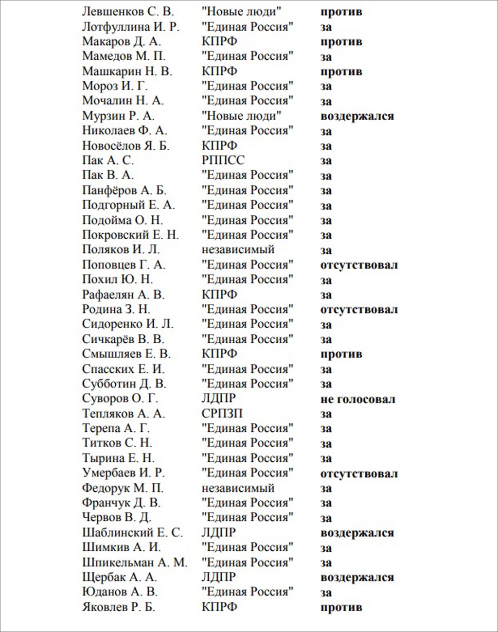 Против выступили подавляющее большинство членов КПРФ (это была публичная позиция фракции), по одному представителю «Новых людей» и «Справедливой России-Патриотов-За правду». Двое «Новых людей» воздержались, ту же позицию выбрали члены ЛДПР и Александр Аверкин из «пенсионеров».