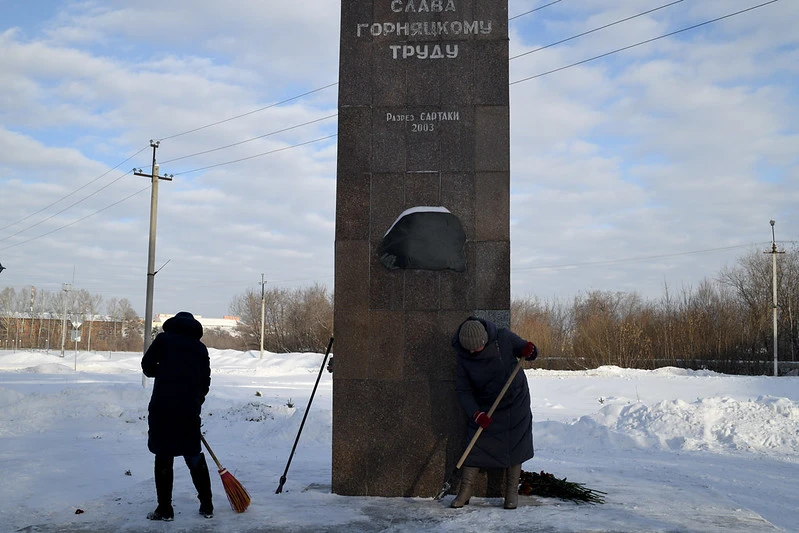 На плитах лежат небольшие стопки замерзших гвоздик, лампадки уже не горят. В центре аллеи, возле стелы «Слава горняцкому труду», две женщины с раскрасневшимися лицами отбивают лопатами лед с постамента. Это — учительница физкультуры и педагог-организатор из местной школы. Обеих зовут Татьянами: одна Ильинична, вторая Александровна, «творческий союз». Каждую среду и пятницу вместе с учениками они приходят сюда на субботник.