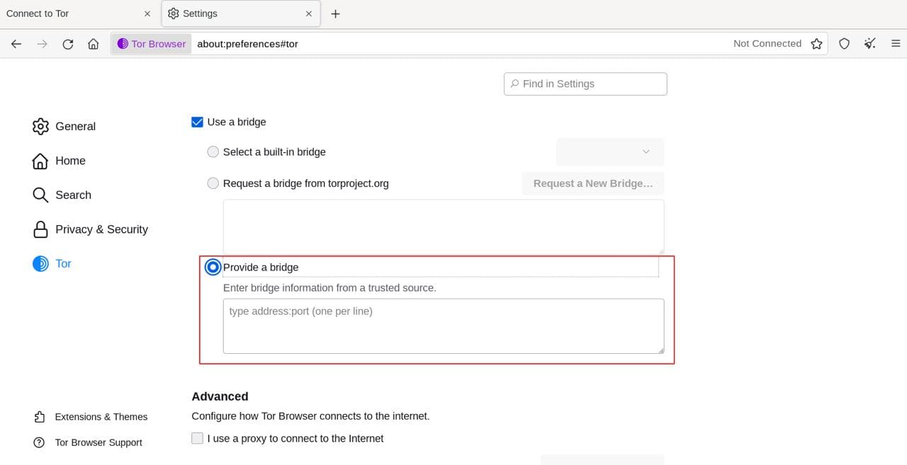 Остальные наши технические специалисты также рекомендуют использование мостов (по крайней мере, в качестве временного решения), которые можно получить по этой ссылке и нужно далее, если Вы используете TOR-Browser, ввести в поле, показанное на этом изображении: