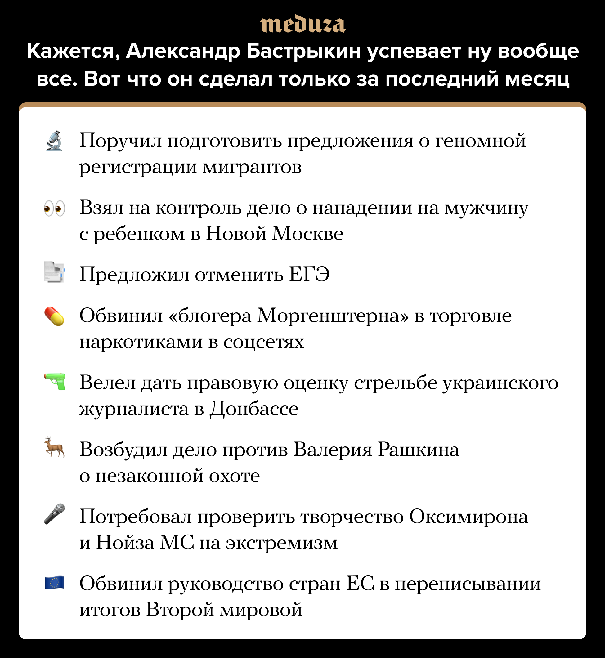 - Бастрыкин поручил проверить песни Оксимирона и Нойза MС после вымышленного заявления «группы патриотов России». Автор обращения назвал его «сатирой на наше время».