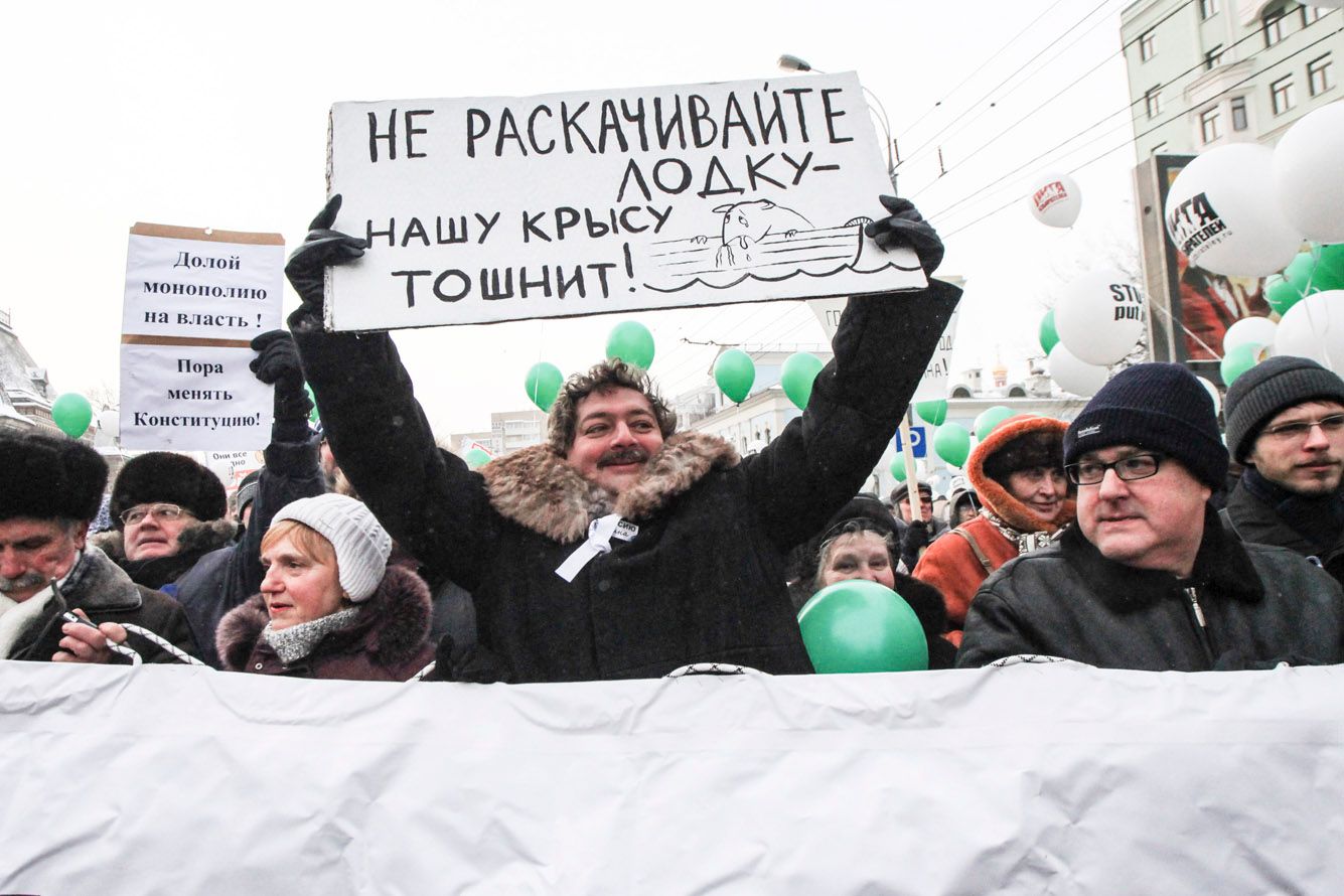 Bykov was responsible for some of the rallies’ most memorable words, including his speech on Sakharov Street on December 24 and his poster (“Don’t rock the boat — our rat might hurl!”) at the march down Yakimanka on February 4. During the protest movement’s most active period, he was part of the Opposition Coordinating Council.