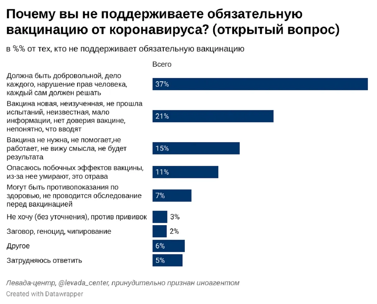 Среди противников обязательной вакцинации от коронавируса преобладает мнение, что прививка должна быть добровольной и что это личное дело каждого (37% от тех, кто не поддерживает обязательную вакцинацию). Также 21% из этой группы не доверяет вакцине, потому что она, по их мнению, «новая, неизученная»; 15% полагают, что вакцина не работает и что от нее «не будет результата». Только 2% опрошенных заявили, что против обязательной вакцинации, так как это «заговор, геноцид, чипирование».