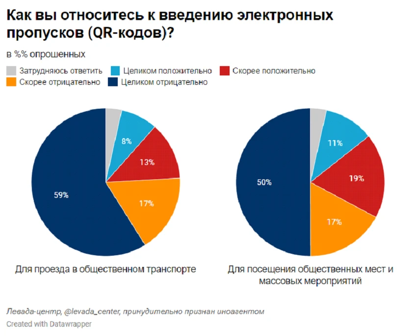 Более половины опрошенных (67%) негативно относятся к введению QR-кодов для посещения ресторанов, музеев, ТЦ и массовых мероприятий, 30% респондентов «Левада-центра» скорее одобряют эту идею.