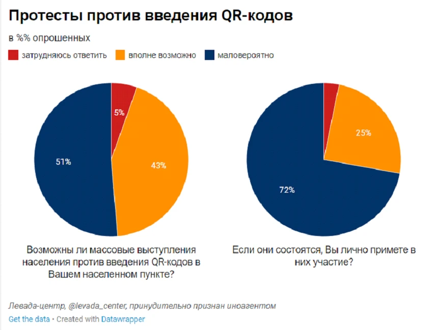Чуть более половины россиян (51%) считают, что массовые выступления против введения электронных пропусков маловероятны, однако 43% все же считают их возможными. Четверть (25%) опрошенных заявили, что были бы готовы принять участие в таких выступлениях, если они состоятся в том населенном пункте, где живет респондент. Более двух третей (72%) россиян ответили, что маловероятно пойдут на такие акции.