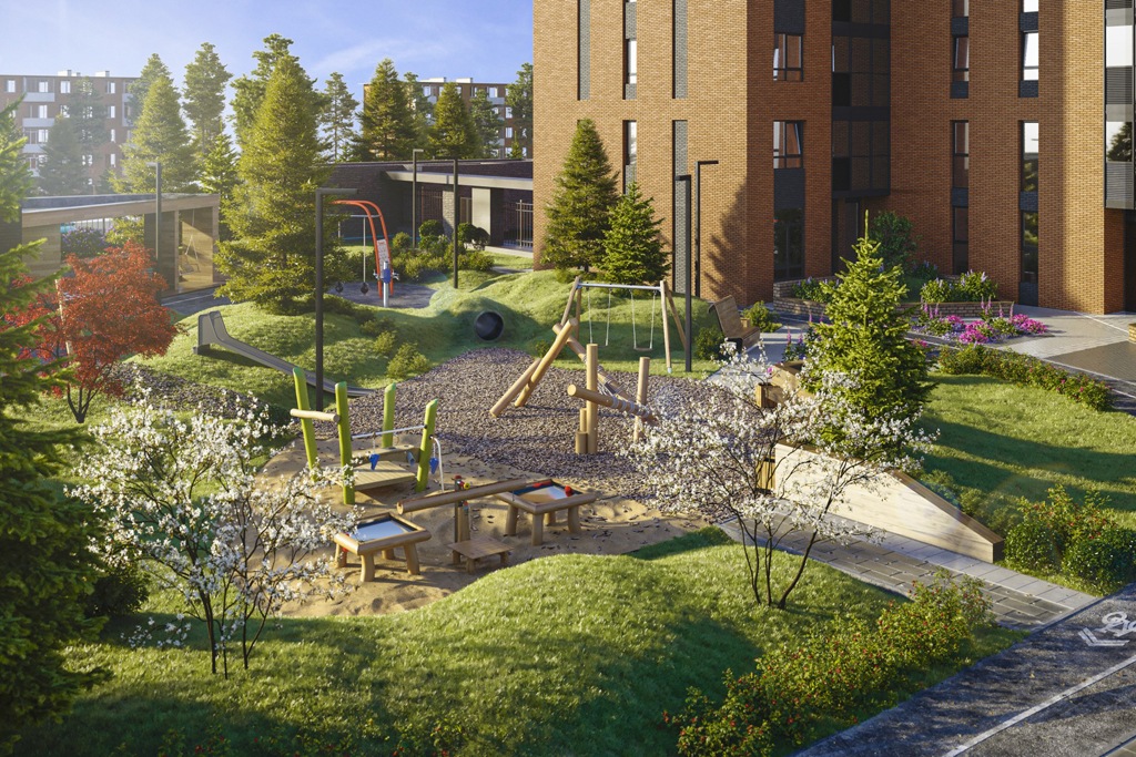 Придомовая пространство благоустроено так, что каждый маленький житель найдет себе занятие по душе. Детская площадка для ребят 3−6 лет оборудована для игр с песком и водой. Беговые дорожки со специальным прорезиненным покрытием, спортивные площадки с оборудованием для полноценных силовых, кардиотренировок и растяжки, беседки для общения будут интересны как подросткам, так и взрослым.