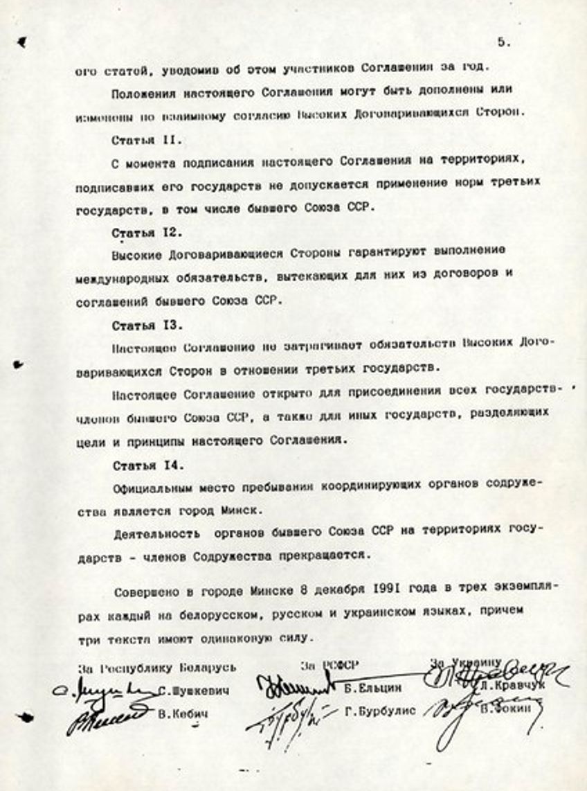 8 декабря 1991 года распался Советский Союз. В этот день в белорусской правительственной резиденции «Вискули» в Беловежской Пуще президент России Борис Ельцин, президент Украины Леонид Кравчук и председатель Верховного Совета Белоруссии Станислав Шушкевич подписали соглашения о ликвидации СССР и создании Содружества Независимых Государств.