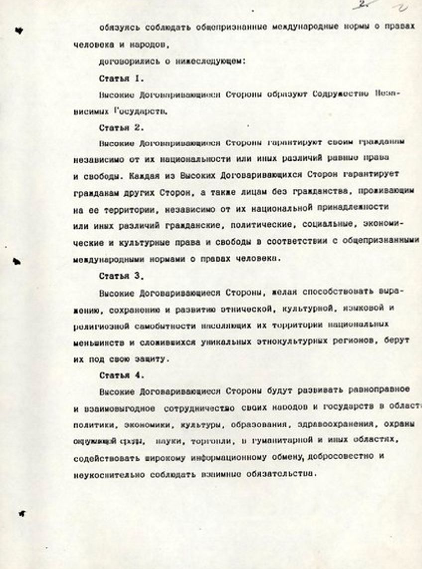 Как говорилось в соглашении, СНГ создавалось на основе «исторической общности народов и сложившихся между ними связях», с намерением «развивать свои отношения на основе взаимного признания и уважения государственного суверенитета, неотъемлемого права на самоопределение, принципов равноправия и невмешательства во внутренние дела, отказа от применения силы, экономических или любых других методов давления, других общепризнанных принципов и норм международного права».