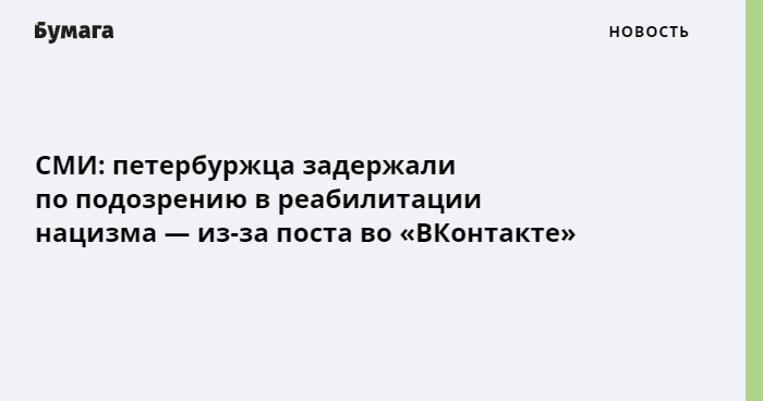 Петербуржца задержали по подозрению в реабилитации нацизма, сообщили 78.ru и «Фонтанка» со ссылкой на источники. По данным изданий, это связано с содержанием поста, который мужчина опубликовал во «ВКонтакте».