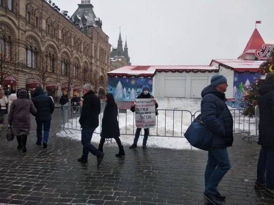 • Также в Москве 12 декабря задержали Марию Сиротину, которая вышла на Пушкинскую площадь с плакатом «С днем Конституции, гарант свобод и прав». Ее отпустили после проверки документов в отделе полиции.