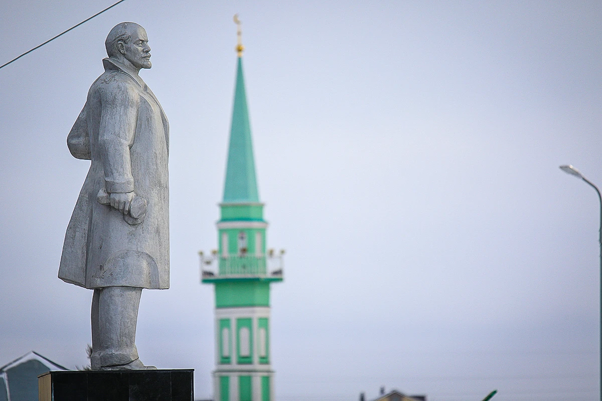 Неподалеку от мечети библиотека и обязательный Ленин. Заговариваю с женщиной, которая остановилась передохнуть, поставив сумки с продуктами на скамейку. Представиться она отказывается категорически, говорит, что до пенсии работала учительницей физики.