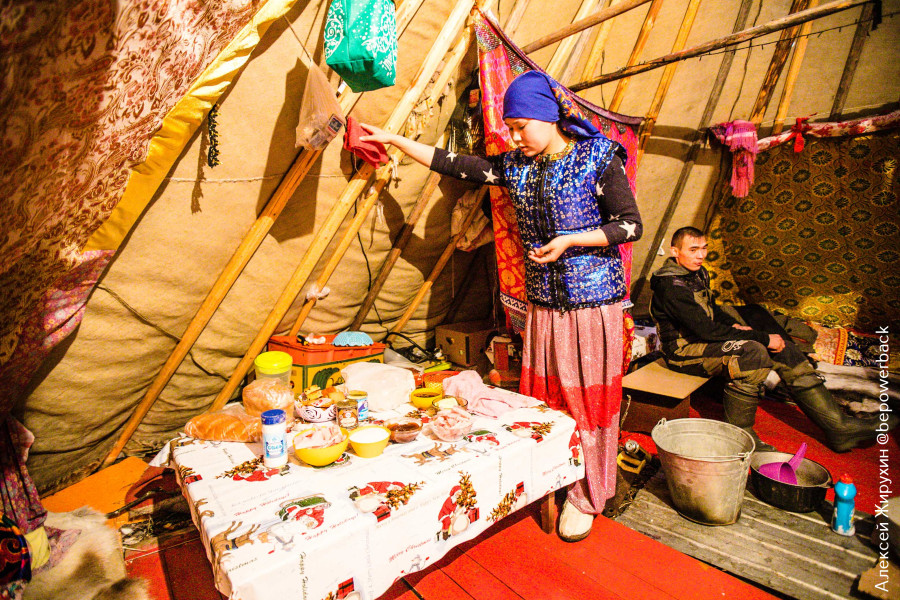 Рацион питания уже не такой скудный как раньше (оленина, рыба и ягода), сейчас всегда есть возможность доехать на снегоходе до ближайшего поселка или фактории (специальный пункт для обслуживания трудового процесса лиц, занятых видами традиционной хозяйственной деятельности) и купить все необходимое: от макарон и хлеба до всяких сладостей. Поэтому не удивляйтесь тому, что на столе в чуме можно увидеть ровно то, что есть и у вас дома.