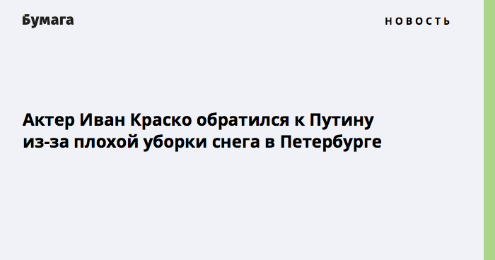 Актер Иван Краско обратился к президенту России Владимиру Путину по поводу несвоевременной и некачественной уборки снега и наледи в Петербурге. Полный текст письма опубликовал «Подъем». Его подлинность изданию подтвердил директор артиста Вячеслав Смородинов.