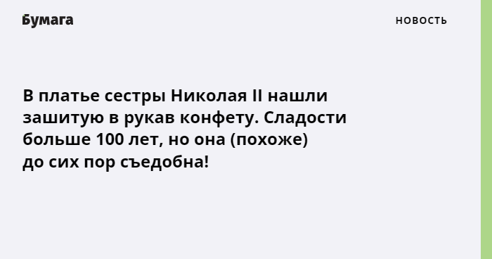 Позднее выяснилось, что это конфета — вернее, надкушенная помадка начала XX века. Вероятно, оставить конфету после пробы было негде, так что княгиня положила ее в рукав. Сладости минимум 118 лет, но она, похоже, пригодна для употребления. «Биологи посмотрели конфету, она ничем не заражена, следов плесени на ней тоже нет», — рассказали в Эрмитаже. Есть ее никто не будет — она останется на хранении в музее.