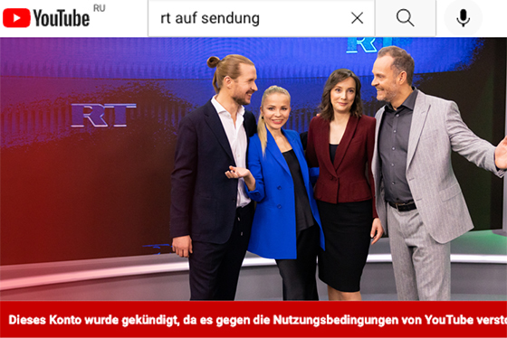 YouTube-канал «RT auf Sendung», транслирующий RT на немецком языке, появился 16 декабря и в тот же день был удален за нарушение правил пользования видеохостингом — за обход ранее наложенных ограничений.