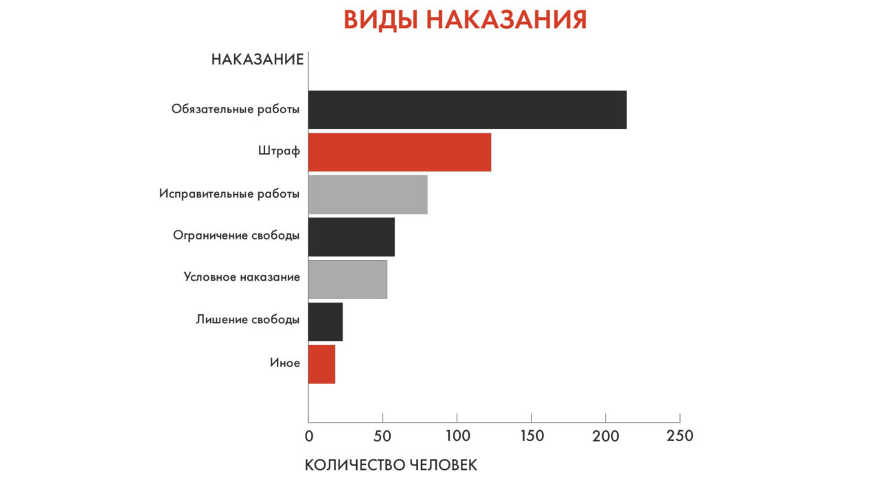 Большая часть приговоров (70 процентов) основаны на части первой статьи — жестокое обращение с животным в целях причинения ему боли и страданий. Остальные 30 процентов — это преступления, совершенные группой лиц, по предварительному сговору или организованной группой в присутствии малолетнего, с применением садистских методов, с публичной демонстрацией, в том числе в интернете, и в отношении нескольких животных.