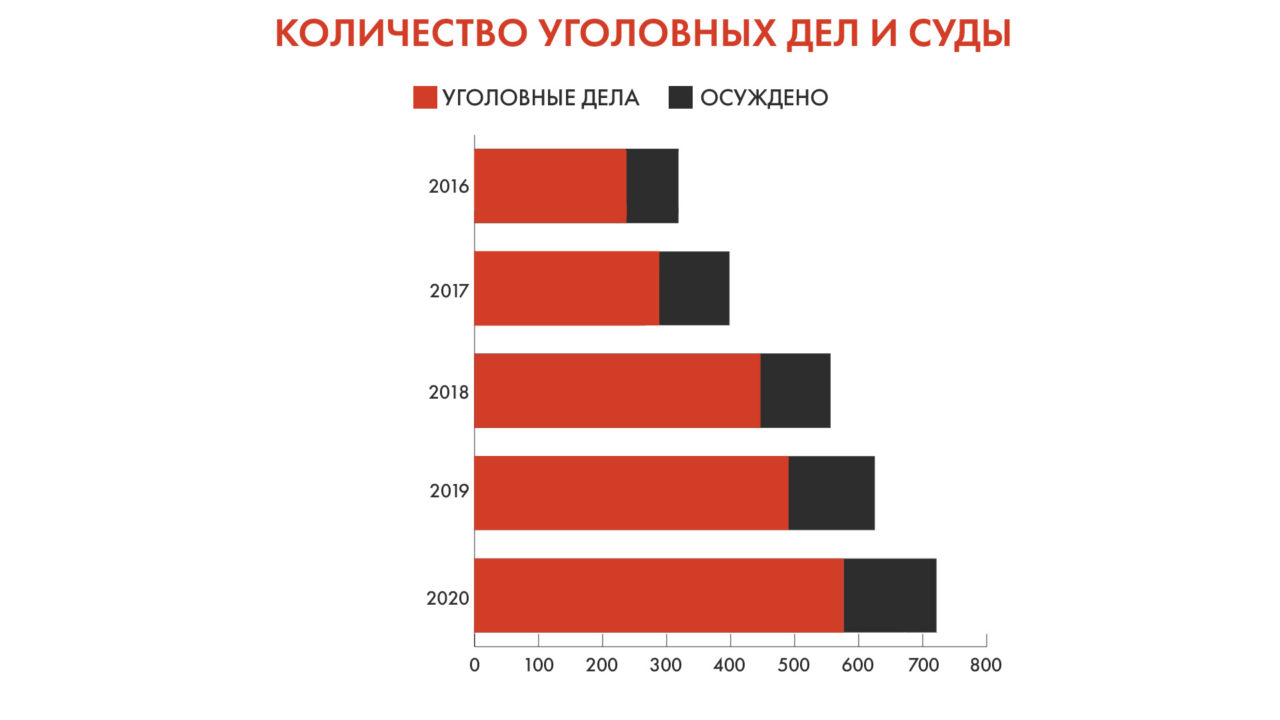 Количество уголовных дел и осужденныхИллюстрация: Софья Янковская «Я лично за последние три года подала примерно 80 заявлений, — говорит юристка Маргарита Гаврилова. — Я что, одна в России пишу заявления? Конечно же нет. В стране огромное количество неравнодушных людей».