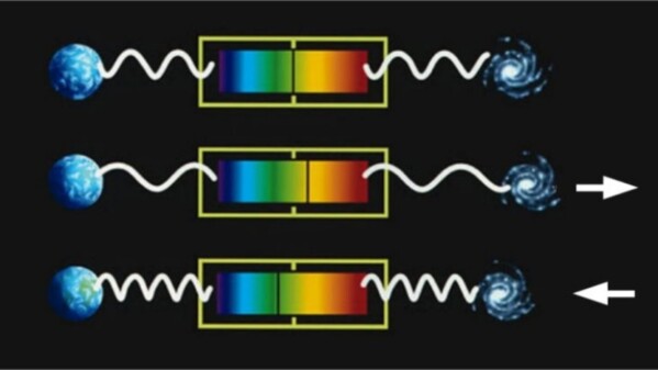Из-за расширения Вселенной эти области с огромной скоростью удаляются от Земли — и по мере «растяжения» пространства растягиваются и волны света, идущие из этих областей к Земле. Частота волн падает, видимая картинка галактик, звёзд и туманностей смещается по спектру «вниз» — в невидимое инфракрасное излучение. Это явление называется космологическим красным смещением.