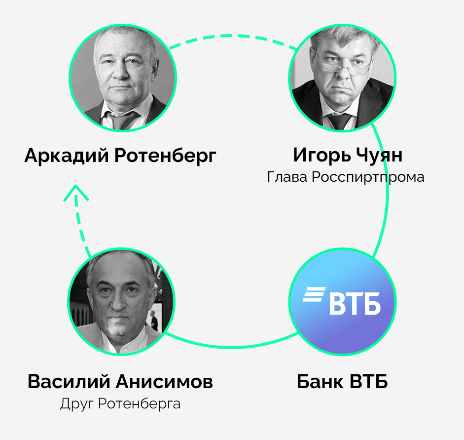 С помощью Чуяна Ротенберг и его партнеры окончательно прибрали к рукам государственные алкогольные активы. В 2006, едва Чуян вступил в должность, «Росспиртпром» заложил 11 лучших спиртзаводов страны в банк ВТБ. А спустя три года банк продал их еще одному другу Ротенберга — Василию Анисимову — бывшему партнеру Алишера Усманова по «Металлоинвесту» и владельцу девелоперской компании Coalco; с Ротенбергом Анисимова тоже объединяет спорт: с 2010 года он возглавляет федерацию дзюдо. Анисимов также построил подмосковный поселок Акулинино, где жил Ротенберг.