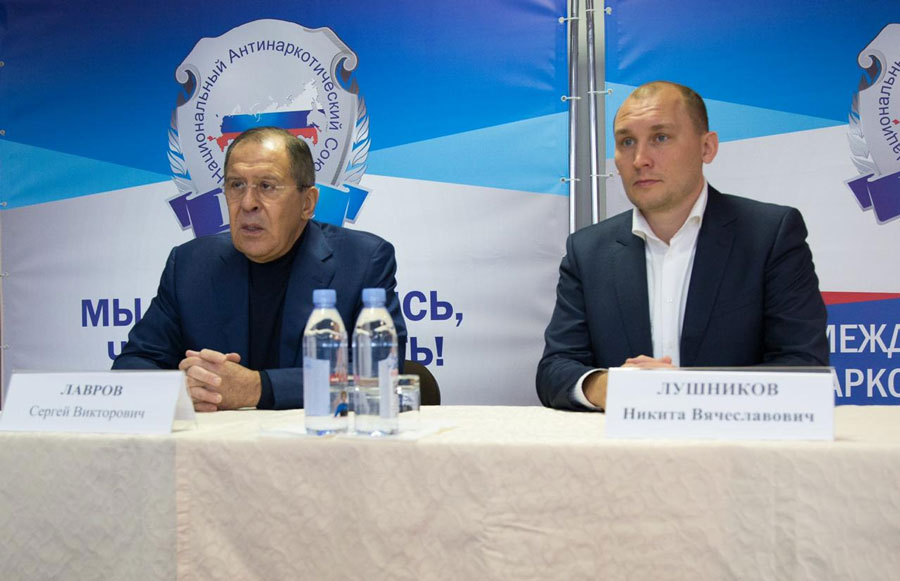 Но «крестным отцом» НАС стал министр иностранных дел России Сергей Лавров — сейчас информация о сотрудничестве НАС с Лавровым и МИДом с сайта Лушникова удалена, но частично сохранилась в кэше Google. «Не устану повторять, что Он один за несколько лет сделал для антинаркотического сообщества больше, чем некоторые профильные ведомства сделали за 10 лет», — так Лушников поздравил с днем рождения главу МИД в своем инстаграме в 2021 году (орфография сохранена). В интервью глава НАС называет министра «нашим флагманом». Это похоже на правду. В интернете можно найти фотографии Лушникова и Лаврова с разных антинаркотических мероприятий, сам Лавров, говоря о Лушникове, тоже рассыпается в комплиментах.